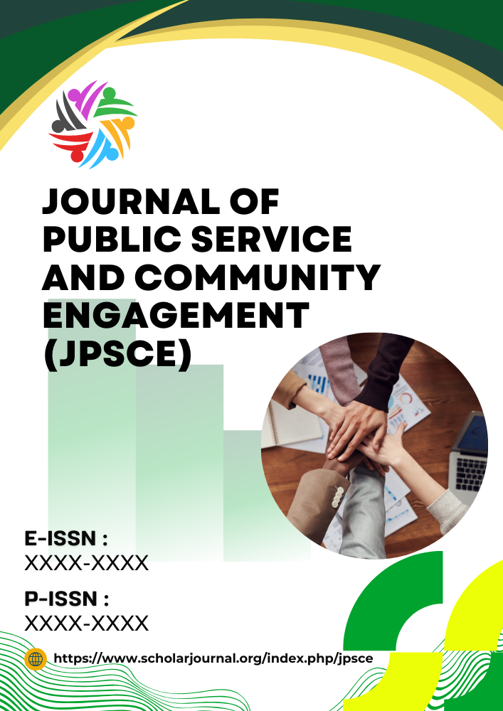Journal of Public Service and Community Engagement (JPSCE) is an academic journal dedicated to publishing research, best practices, and innovative approaches in public service and community engagement. The journal aims to bridge the gap between academic research and real-world community development by showcasing impactful projects, case studies, and analyses. Covering a wide range of topics such as community-based research, public policy, social innovation, and collaborative partnerships, JPSCE serves as a platform for scholars, practitioners, and policymakers to contribute to sustainable and inclusive community transformation.
